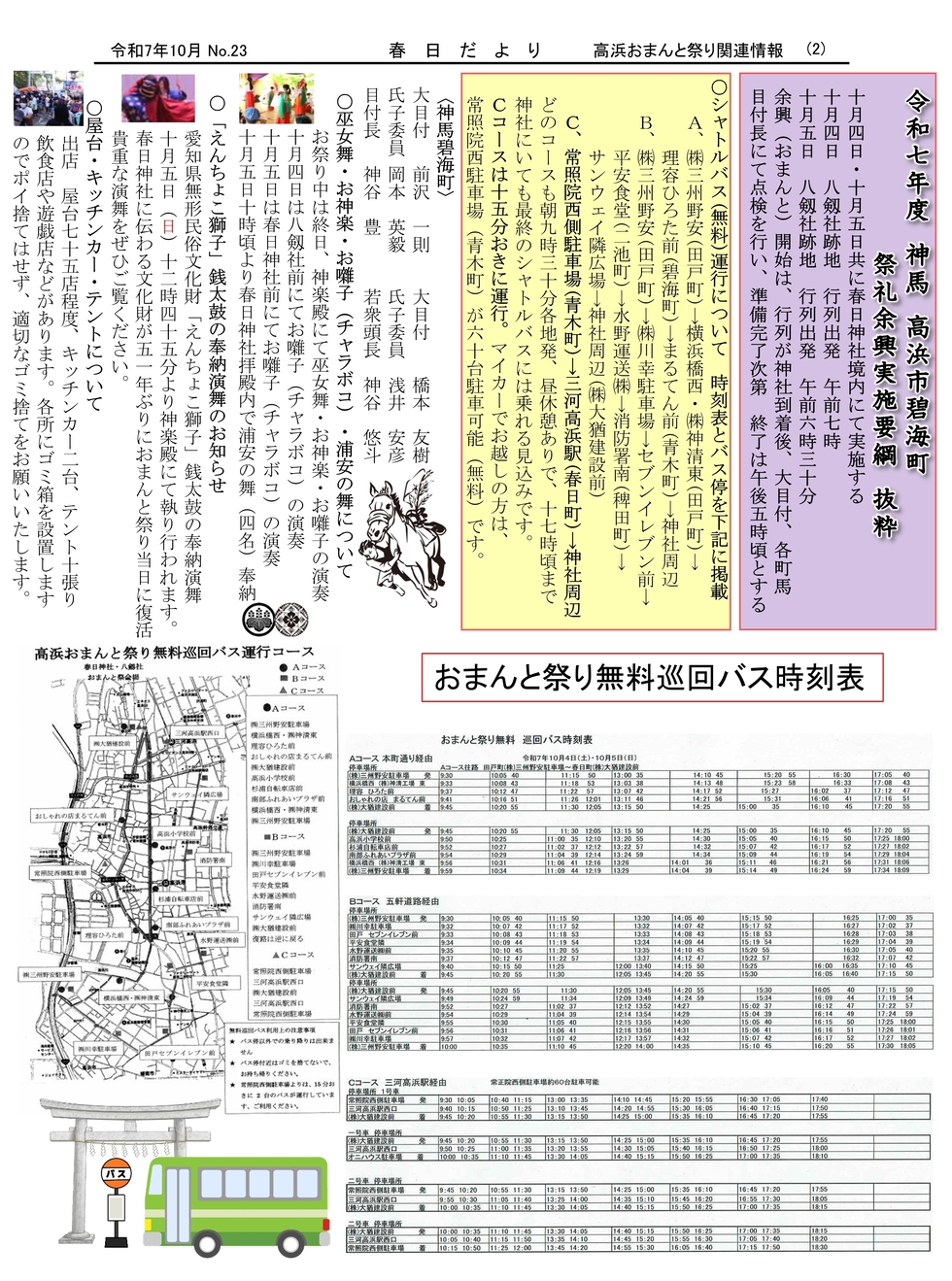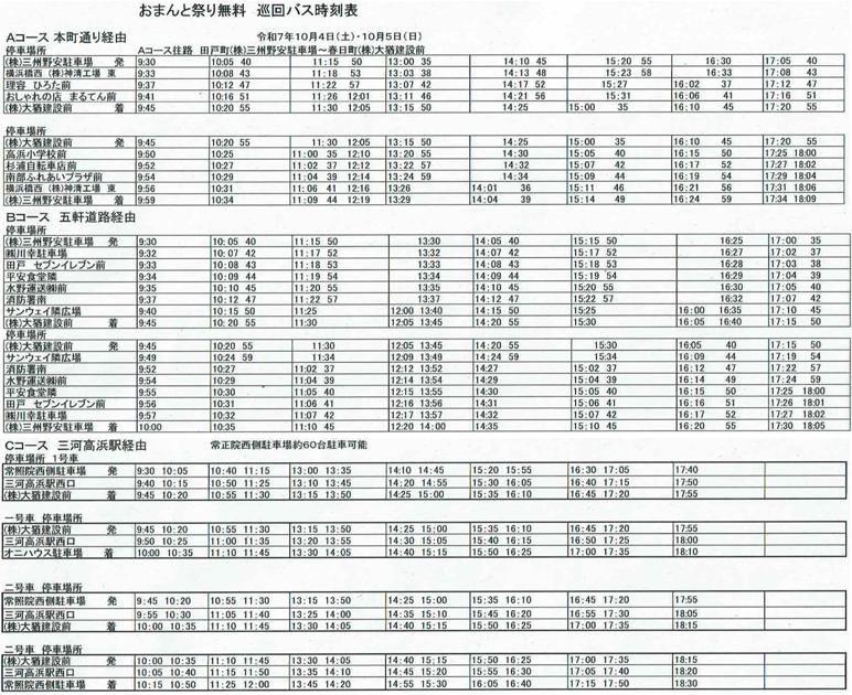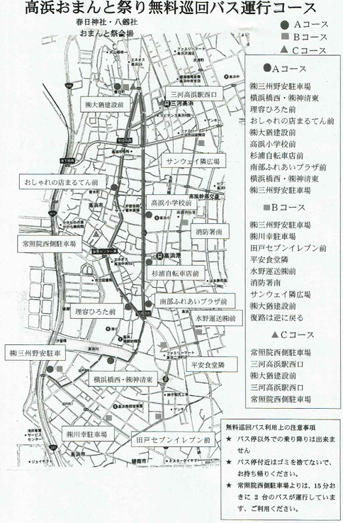 ※当日は境内周辺に交通規制がございます。自家用車は利用せず、下記のシャトルバスをご利用ください。(電車で名鉄三河線三河高浜駅ご利用の方は、三河高浜駅西口から15分置きに運行するシャトルバスをご利用されるのがお勧めです。)