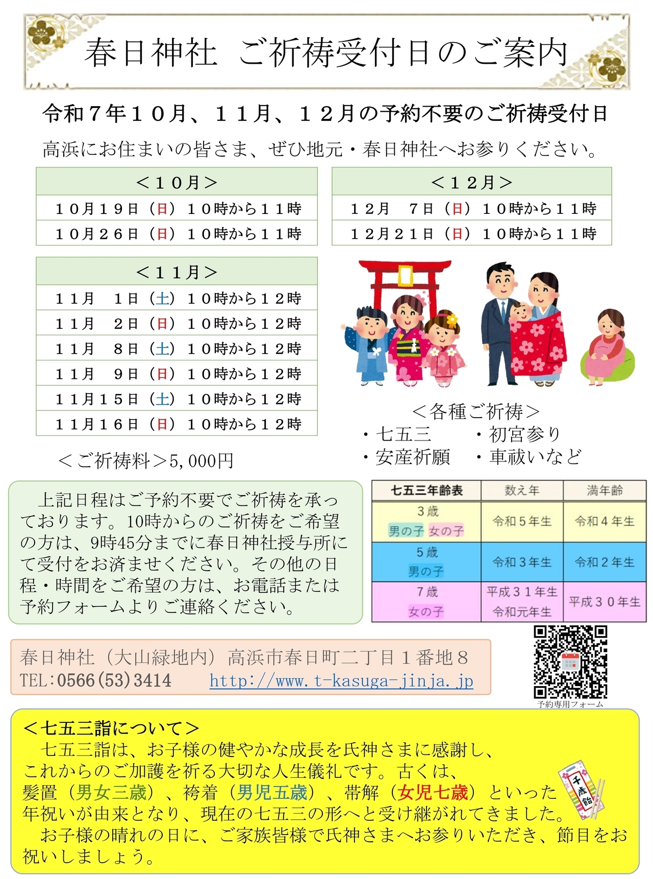 春日神社では、氏神様への感謝とこれからの健やかなるご成長を祈念する七五三詣のご祈祷を、下記の通り奉仕いたします。