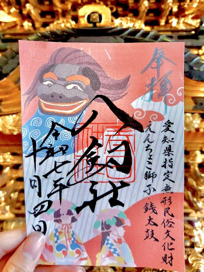 愛知県無形民俗文化財「えんちょこ獅子」と銭太鼓の可愛らしいイラストがあしらわれています。