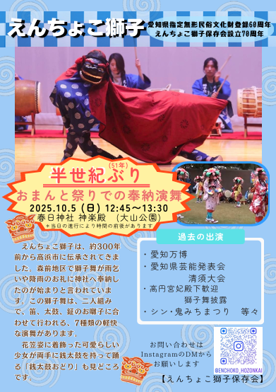 令和7年は「えんちょこ獅子保存会」が発足してから70周年という節目の年、また「えんちょこ獅子」が愛知県無形民俗文化財に登録されてから60周年の年となります。これを記念し、春日神社にて「えんちょこ獅子・銭太鼓」の特別公演を開催いたします。「えんちょこ獅子・銭太鼓」は、愛知県の無形民俗文化財に指定されている伝統芸能であり、古くから地域の祭礼や祝いの場で親しまれてきました。